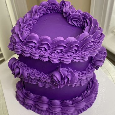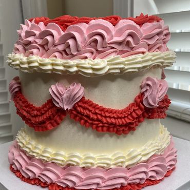Vintage style cake heart shaped in one solid color. Add additional colors for $5 each. This cake feeds up to 15 people.