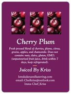 Fresh pressed blend of cherries, plums, citrus, greens, apples, and chamomile. Does not contain: nuts, dairy, gluten, GMO. (unpasteurized fruit juice, drink within 7 days, keep refrigerated).